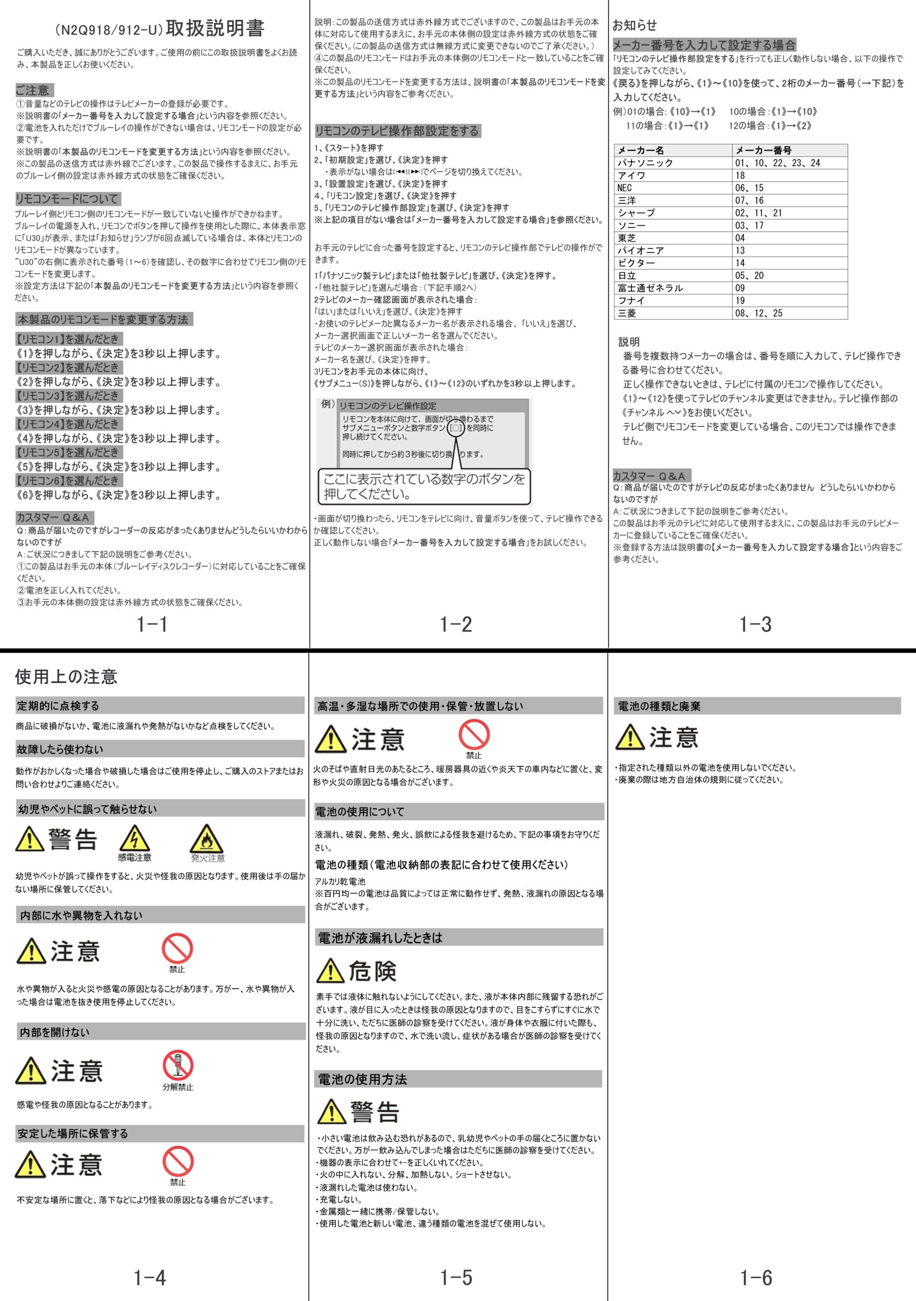 説明書 急に操作ができなくなった場合は初期設定をお試しください。 テレビリモコン シャープ SH-GA-939SH-GB047WJSASH-GA881WJSASH-952WJSASH-738WJSASH-228SASH-GB026WJSASH-355SA SONY SN-JD018RMF-TX300JSN-TX410J 三菱 MI-RL21009MI-RL18502MBERL301/201 パナソニック PA-N2Q589PA-N2Q814PA-N2Q848MBR-N2Q017 日立 Hi-RT4 東芝 TO-90348TO-90320ATO-90495/TO-90485MBE90493/90467MBE90502MBE90483/87/89/96 フナイ FN-101BDRFN-100BDR レコーダーリモコン シャープ SH-955SHSH-979PASH-908PASH-651PASH-017PASH-212PA SONY SN-B015J SN-B005J SN-B003J-2 SN-B006J SN-B007J-3SN-VR110J 東芝 SE-R0457TO-R0389-4TO-R0383TO-R0462TO-R0466TO-R0468 パナソニック PA-N2Q472-4PA-N2Q912PA-N2Q994PA-N2Q920PA-N2Q1234PA-N2Q223PA-N2Q086PA-N2Q182MBEN2Q918 エアコンリモコン 三菱 AR151-MI 東芝 TOS-UB03NJ 富士通 FUT-RCA1J シャープ AR909JBAR987JB パナソニック PA-75C026PA-75C001PA-75C540PA-75C280PA-75C3308 日立 HI-6Z2 照明リモコン パナソニック PA-9327K